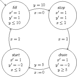 As a standard example, consider the bouncing ball [10]. A ball falls from height h and bounces back from the ground (h=0) after an elastic deformation. The current speed of the ball is denoted by v, and t is a clock measuring the falling time. We assume an arbitrary positive gravity force g and that the ball loses energy according to a damping factor 0≤c<1.